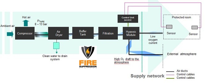 The process of Hypoxic Air Fire Suppressions systems, seperates Oxygen from the air that is pushed through the Nitogen membranes. Nitrogen is diverted into the room and Oxygen is directed to atmosphere